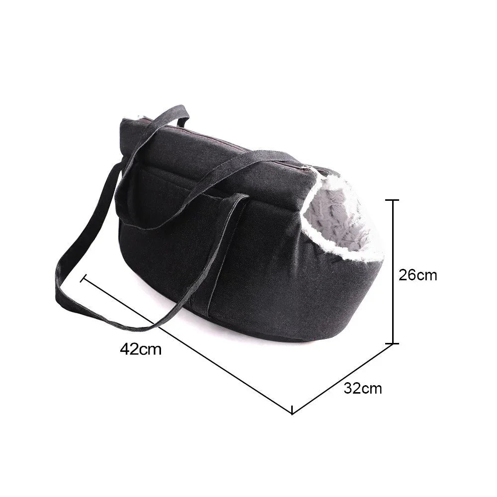 • Type: Pet carrying bag • Colors: Blue, beige, gray, black, and red One size fits all. • Dimensions: 42 x 26 x 32cm • Material: Denim or plush • Closure: Zipper • Includes: 1x bag with internal leash attachment